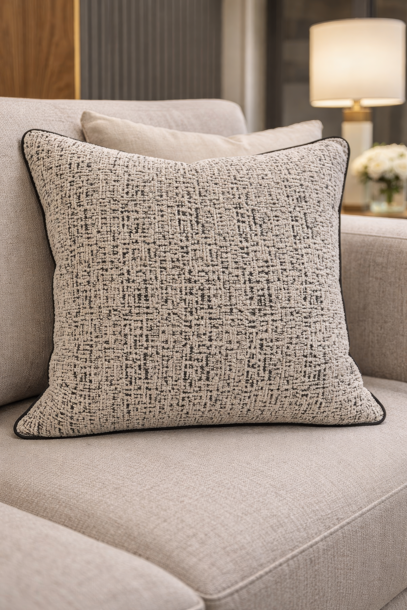 Apportez une touche de raffinement discret à votre intérieur avec ce coussin décoratif en velours texturé. Son tissu subtilement structuré offre un jeu de relief élégant, tandis que ses teintes neutres et apaisantes s’intègrent facilement à tous les styles de décoration. Le passepoil contrasté vient souligner délicatement ses lignes, ajoutant une finition soignée et contemporaine. À la fois sobre, confortable et sophistiqué, ce coussin est idéal pour sublimer un canapé, un fauteuil ou un lit dans un univers chic, moderne ou minimaliste.